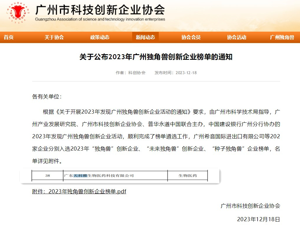 根據(jù)廣州市科技創(chuàng)新企業(yè)協(xié)會(huì)網(wǎng)12月18日《關(guān)于公布2023年廣州獨(dú)角獸創(chuàng)新企業(yè)榜單的通知》內(nèi)容所示,天科雅入選2023年“未來(lái)獨(dú)角獸”創(chuàng)新企業(yè)榜單。