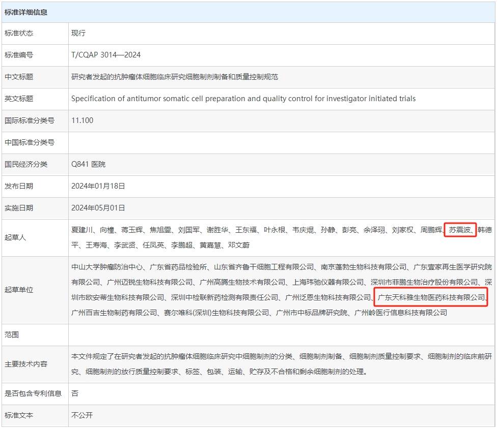 中山大學(xué)腫瘤防治中心主任導(dǎo)師兼中國醫(yī)藥質(zhì)量管理協(xié)會細(xì)胞治療質(zhì)量控制與研究專業(yè)委員會主任委員夏建川、實(shí)驗(yàn)研究部副研究員向橦、廣東省藥品檢驗(yàn)所一級主任科員蔣玉輝、廣東天科雅生物醫(yī)藥科技有限公司等參與起草,助力推動中國抗腫瘤體細(xì)胞臨床研究。