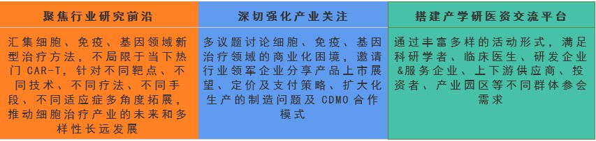 本屆大會誠邀國內(nèi)外領(lǐng)先學(xué)術(shù)科研機(jī)構(gòu)、大型醫(yī)院、產(chǎn)業(yè)鏈上下游企業(yè)、國家監(jiān)管機(jī)構(gòu)、產(chǎn)業(yè)園區(qū)、投資機(jī)構(gòu)、行業(yè)協(xié)會等專業(yè)人士共聚上海,分享行業(yè)進(jìn)展動態(tài),探討產(chǎn)業(yè)發(fā)展瓶頸及細(xì)胞治療和基因治療的未來之路!